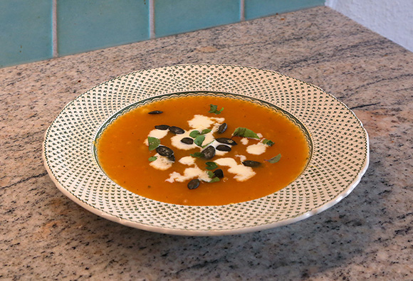 - Servieren: Suppe auf Suppenteller verteilen und mit gerösteten Kürbiskernen, Petersilie und etwas Sahne garnieren.