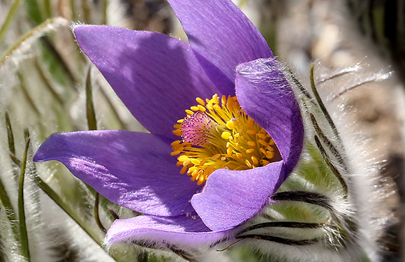 Die Küchenschelle (oder Kuhschelle), wissenschaftlich Pulsatilla vulgaris, zählt zu den frühblühenden Pflanzen aus der Familie der Hahnenfußgewächse (Ranunculaceae). Ihre glockenförmigen Blüten sind violett bis rotviolett gefärbt. Die Blüten stehen einzeln und erscheinen von März bis April. Die Blätter entwickeln sich erst während der Blütezeit und sind gefiedert. Die Pflanze fällt wegen ihrer dichten Behaarung auf. Die feinen und hellen Haare bilden eine isolierende Schicht, reflektieren einen Teil des Sonnenlichts und verhindern eine Überhitzung sowie Strahlungsschäden. Zusätzlich schützt die Behaarung vor dem Wind. Sie dient der Befestigung/Unterstützung der Blütenknospen, die am Ende des Winters nach oben geschoben werden. Die Blütenknospen werden bereits im Herbst gebildet.