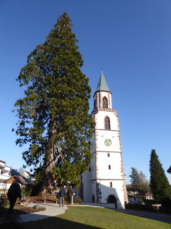 Der Mammutbaum (Sequoiadendron giganteum), im Englischen auch „Redwood“ genannt, ist ein imposantes Nadelgehölz. Das Solitärgehölz ist pflegeleicht, frosthart und anspruchslos. Im Sequoia-Nationalpark steht momentan der höchste lebende Mammutbaum mit 83,80 Metern. Erfreulich ist, dass auch im Landkreis Lörrach Mammutbäume heranwachsen. Sie erreichen jedoch nur Wuchshöhen von 25 bis 40 Metern. Der bekannteste ist der Eichsler Mammutbaum mit einer Höhe von 36,4 Metern. Der Baum steht in der Nähe der gotischen Kirche mit dem 48 m hohen imposanten Kirchturm (s. Foto).