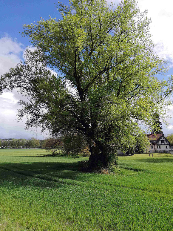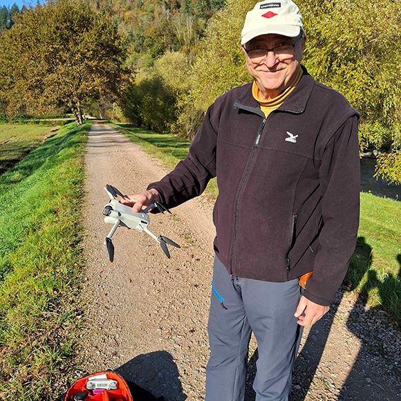 Werner F. Müller, Vorstandsmitglied im Schwarzwaldverein Schopfheim, hat sich bereit erklärt, mir die Messung zu zeigen. Er brachte die Drohne in einem Rucksack per Fahrrad in die Nähe der mächtigen Schwarzpappel, die sich in der Nähe des Wasserwerks „Herzenau“ bei Maulburg (Nähe Schopfheim) befindet. Der imposante Baum hat einen mächtigen Umfang und eine beträchtliche Höhe.