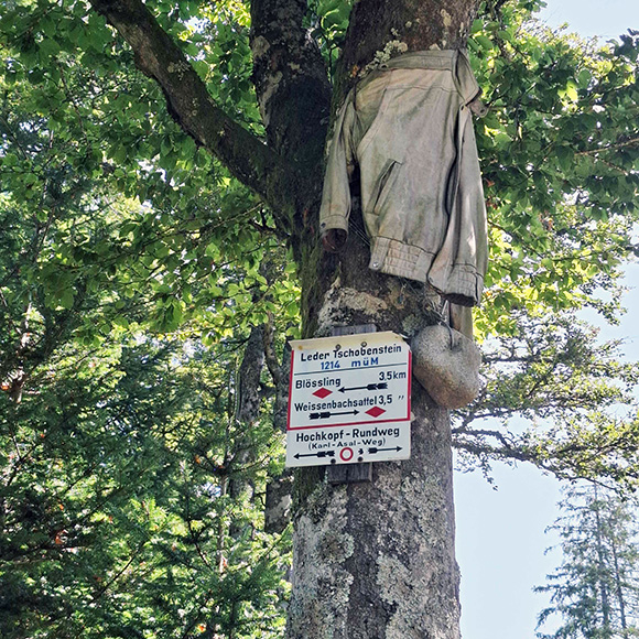 Den Leder-Tschobenstein, den wir schon 2019 in Augenschein nahmen, wollten wir unbedingt nochmals sehen. Es ging auf schmalen Wegen, die teilweise durch Heidelbeersträucher begrenzt waren, dorthin. Es ist wirklich ein skurriler Ort. An einem Baum hängt ein Stein und eine Jacke (Ledertschoben). Der hängt schon sehr lange, dass er Eingang auf Karten gefunden hat.