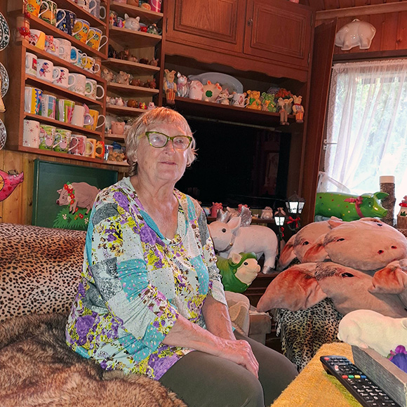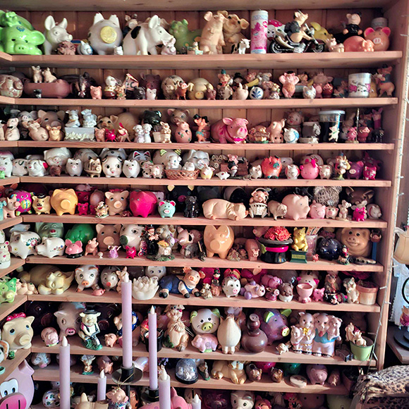 Die Schweinchen findet man auf Bilder, Gläser, Kaffeetassen, Kuscheltiere, Lampen, Bierkrüge. Sogar am Haupteingang ist eine Glocke und ein Kleiderhaken mit einer Tierverzierung zu sehen. Besonders üppig ist das Wohnzimmer eingerichtet. In jeder Ecke des Wohnzimmers und auf einer Treppe sitzen, thronen Tiere mit und ohne Ringelschwänzchen. Die Vielseitigkeit der Farben und Formen des herzlichen Tieres sind überall präsent. Da kommt man aus dem Stauen nicht heraus. Damit noch nicht genug, auch auf der Terrasse, auf einer Grünfläche im Garten und auf dem Dach ihres Hauses sind Tiere in allen Variationen zu sehen. Sogar 2 Solarschweine hat sie erworben.  Während eines Besuches des BZ-Autors verrät sie eine Besonderheit: Sogar auf ihrer Bettwäsche prangen viele Fotos von Schweinchen. Die Sammlerin hat ihre Objekte noch nicht gezählt. Sie schätzt diese auf mehr als 1000 Exemplare.