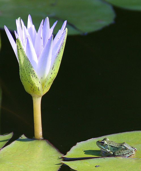Seerose und Frosch: Der Frosch mit der Seerose wurde im botanischen Garten in Freiburg aufgenommen. Es ist eine sehr schöne Komposition einer Pflanze mit einem neugierigen Frosch. Da Frösche sehr scheu sind, sollte man beim Fotografieren sehr vorsichtig sein und langsam heranschleichen, damit der Frosch nicht weghüpft, bevor der Auslöser gedrückt wird