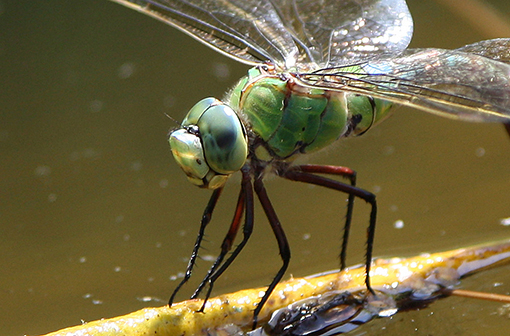 Grosse Königslibelle: Die Königslibelle sieht aus wie ein Monster aus einer anderen Welt. Sie wurde auch im botanischen Garten in Freiburg aufgenommen. Die Männchen sind sehr aktiv, sie fliegen dauernd herum, ohne sich abzusetzen. Sie liefern sich Luftkämpfe mit anderen, meist unterlegenen Arten. Sie werden dadurch aus dem Revier vertrieben. Es ist die grösste und kräftigste heimische Libelle. Beide Geschlechter haben eine grüne Brust und einen blauen Hinterleib.