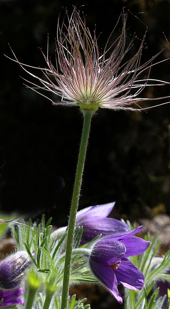 Die Frucht der Küchenschelle ist ein silbrig-fedriger Samenstand, der sich nach der Blütezeit im Sommer entwickelt. Es handelt sich botanisch um eine Sammelfrucht, die aus vielen kleinen Einzelfrüchten besteht und vom Wind verbreitet wird.